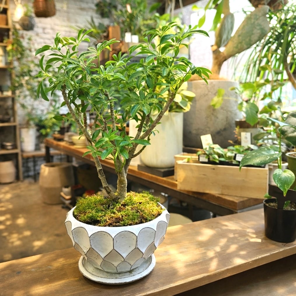 本株は、苔で仕立てた表土と相性の良い、白の浅型陶器鉢に合わせた上品な一鉢。