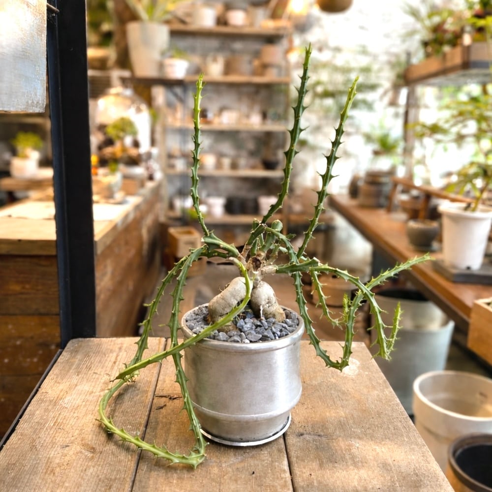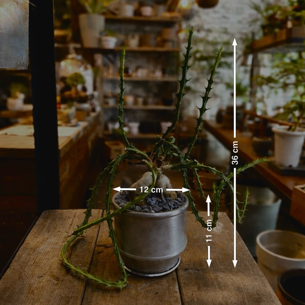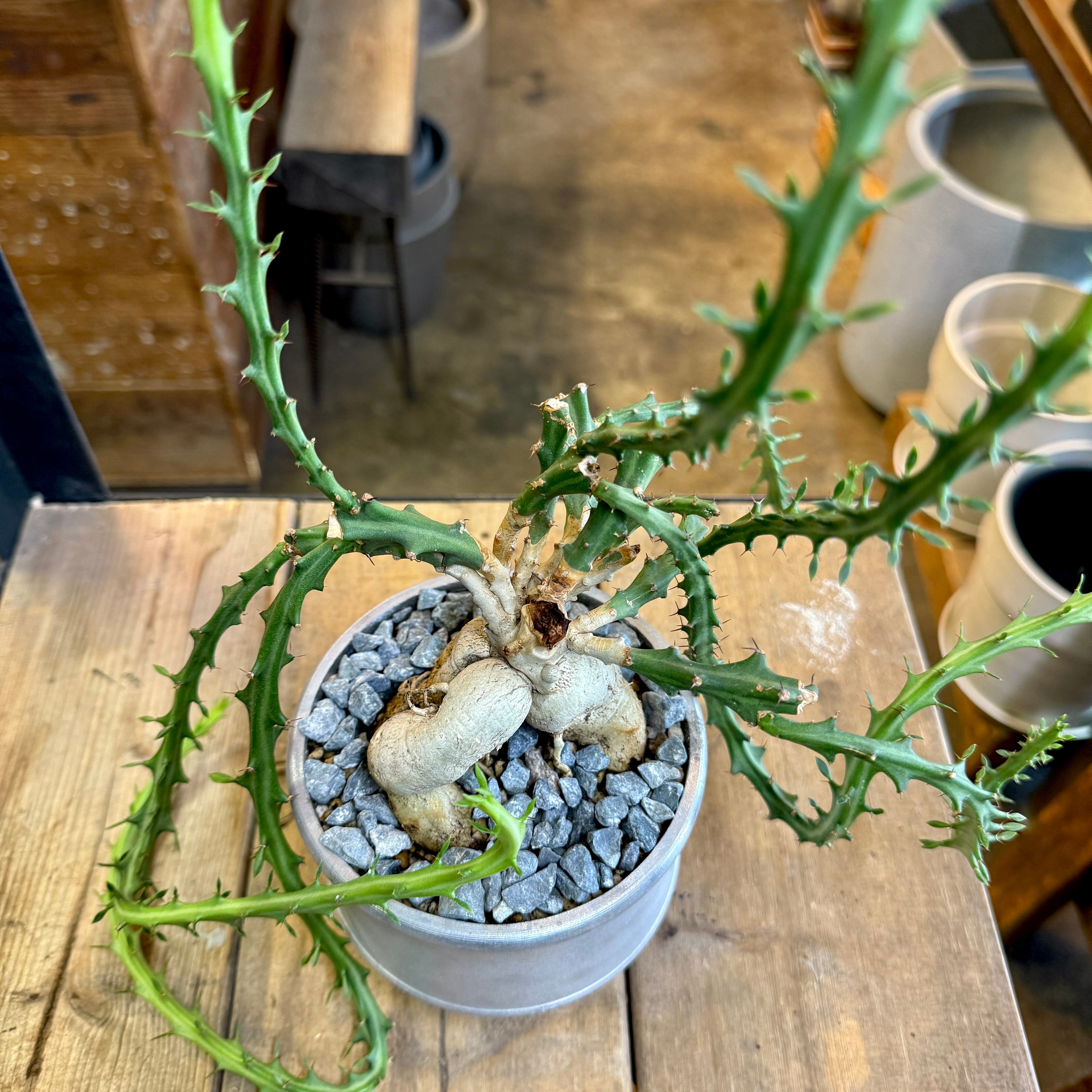 塊根部分から放射状に伸びるトゲのある枝は、まるでオブジェのような造形美で、空間にしっかりとしたアクセントを与えてくれます。