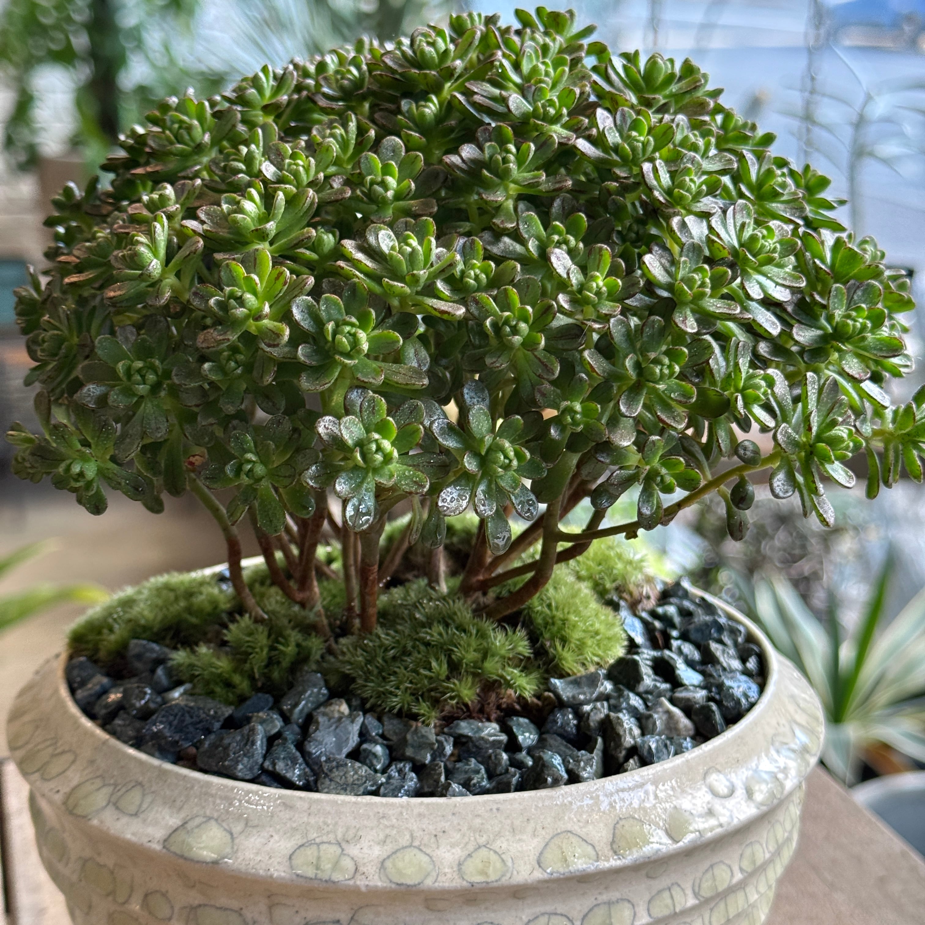 細い幹の上にこんもりと広がる葉が、まるでミニチュアの樹木のようなシルエットをつくり、足元にはやわらかな苔と石をあしらった、景色として楽しめる一鉢です。